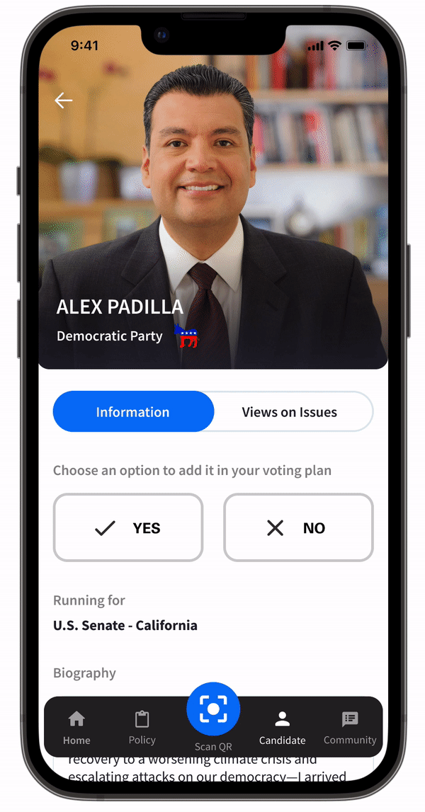 Get timely registration reminders and election updates. Access policy details and candidate information to make informed decisions and seamlessly add them to your voting plan.